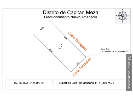 El inmueble tiene una categoría Urbana. Se encuentra en el Distrito de Capitán Meza. Sobre calle de Terraplén (de 3er. orden), que une a 250 m. con la Ruta Py. Nº 07, con pavimento tipo asfaltado de 1er. orden estructurante, donde se desarrolla la zona urbano – comercial de Capitán Meza. El inmueble se encuentra, dentro de una fracción denominado Nuevo Amanecer, en un radio poblacional de 360 m, cercano a las necesidades de la vida moderna, centros comerciales, mercados, estaciones de servicios, Supermercados, y otros, se encuentra terreno con topografía alto y seco, en zona con población medianamente poblado. Los inmuebles de esta zona tienen un factor de comercialización nivelado. Condiciones ambientales: Es un lugar que cuenta con suficientes áreas verdes, rodeada de grandes extensiones de tierra tipo agrícola. -