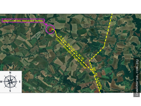 El inmueble tiene una categoría eminentemente rural está ubicado sobre Ruta Naranjito – Nueva Aurora de tipo terraplen (de 3er. orden), a 8 km. Del cruce Nodo Naranjito, que se se encuentra sobre Ruta Py. Nº 06 de 1er. orden estructurante, donde se desarrolla actividad comercial de forma lineal. El inmueble se encuentra en una zona rodeada de grandes extensiones de tierras tipo mecanizado para la agricultura de forma directa. La propiedad tiene forma geométrica rectangular con topografía variado plano bajo, alto y seco con correcciones de curvas de desnivel que permiten el aprovechamiento de la tierra para su uso en la agricultura en un 100 %. - Condiciones ambientales: Es una zona muy deforestada, rodeada de grandes extensiones de tierras para la explotación agrícola con pequeñas Reservas forestales. -